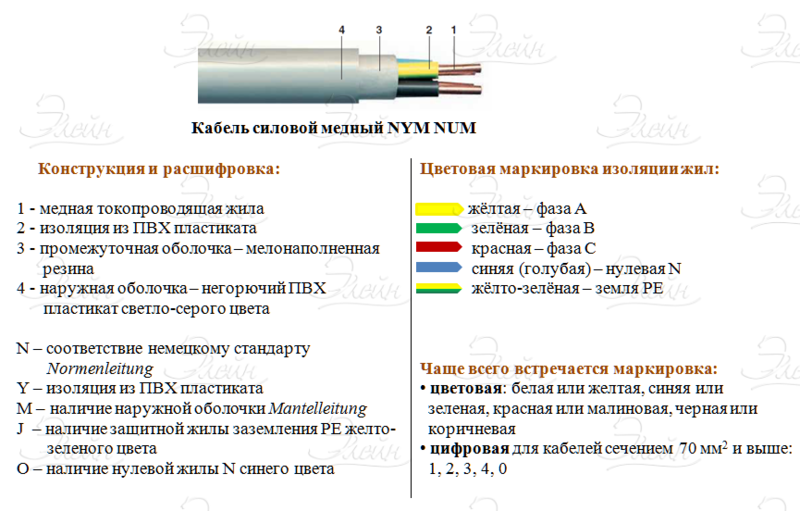 Структура конкретного изделия зависит от сечения кабеля. Как писалось выше, для диапазона 0,5-10 кв. мм жила может быть цельной, от 16 кв. мм и больше – многопроволочной. - Слой изоляции, произведенный из поливинилхлорида. Имеет цветовую маркировку, выбранную заказчиком (если это не заземляющий кабель).