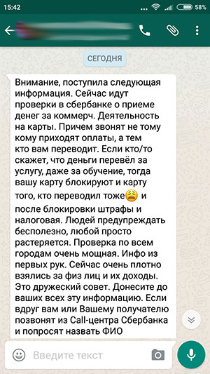 «Внимание, поступила следующая информация. Сейчас идут проверки в Сбербанке о приеме денег за коммерческую деятельность на карты. Причем звонят не тому кому приходят оплаты, а тем, кто вам переводит. Если кто-то скажет, что деньги перевел за услугу, даже за обучение, тогда вашу карту блокируют и карту того, кто переводил тоже. После блокировки штрафы и налоговая. Людей предупреждать бесполезно, любой просто растеряется. Проверка по всем городам очень мощная. Инфо из первых рук. Сейчас очень плотно взялись за физлиц и их доходы. Это дружеский совет», — следует из сообщения. (Здесь и далее пунктуация автора сохранена. — РБК.)