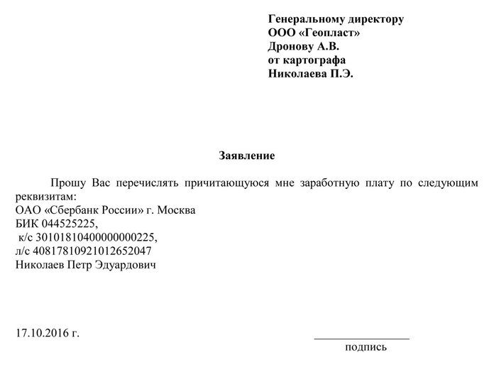 Заявление на перечисление заработной платы на банковскую карту — образец