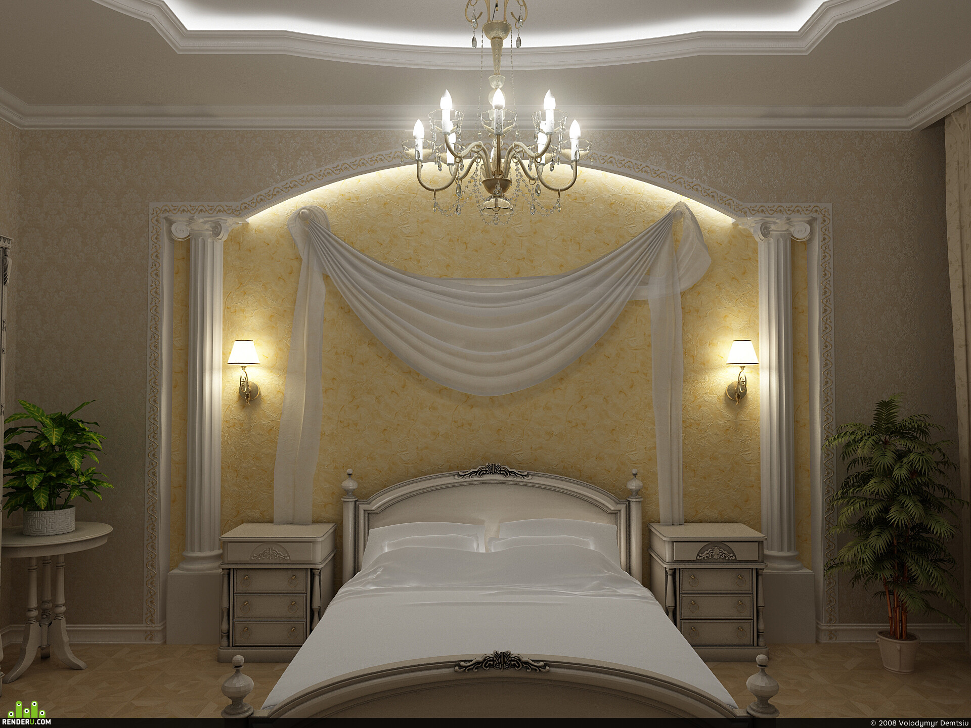 В классических стилях — английском, французском — в спальне устанавливаются кровати с роскошными изголовьями и изящными резными каркасами. Кровать делает интерьер более богатым и благородным, ее не следует сильно огораживать балдахином. Поэтому чаще всего в таких спальнях используют настенные купольные навесы, не закрывающие кровать и выполняющие чисто декоративные функции.