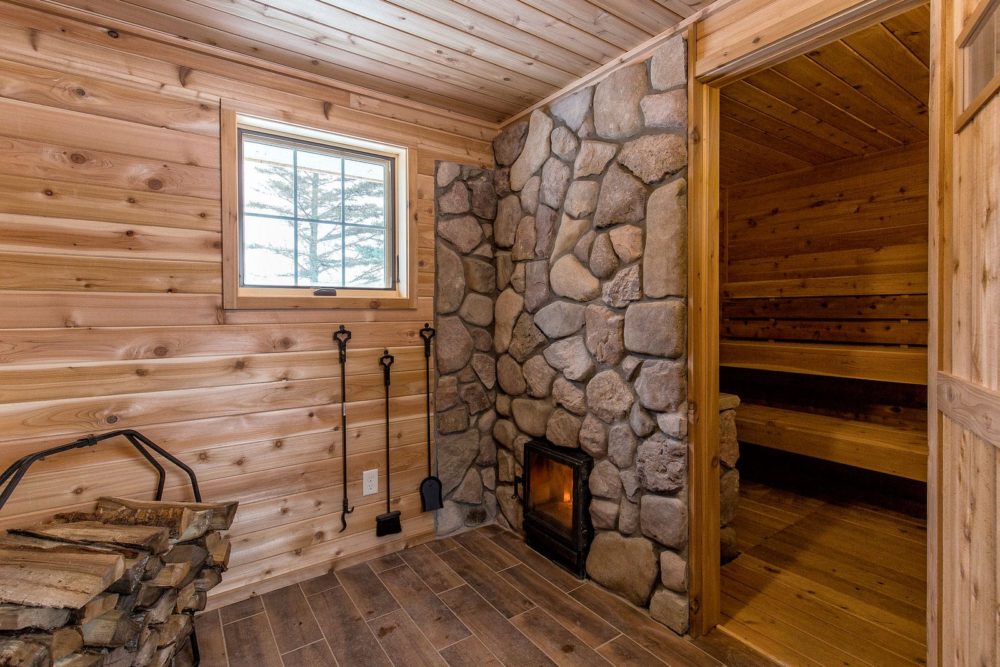 - Лучи заходящего солнца, проникающие в парную через окно, снимут стресс, но надо одновременно сделать и так, чтобы вход в баню хорошо просматривался из окна дачного домика. Так можно наблюдать за топящейся баней и за детьми, особенно когда перед входом сооружен бассейн.