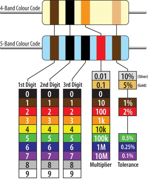 | Черный (0) Коричневый (1) Красный (2) Оранжевый (3) Желтый (4) Зеленый (5) Синий (6) Фиолетовый (7) Серый (8) Белый (9) | Черный (0) Коричневый (1) Красный (2) Оранжевый (3) Желтый (4) Зеленый (5) Синий (6) Фиолетовый (7) Серый (8) Белый (9) | Черный (0) Коричневый (1) Красный (2) Оранжевый (3) Желтый (4) Зеленый (5) Синий (6) Фиолетовый (7) Серый (8) Белый (9) | Черный (1) Коричневый (10) Красный (100) Оранжевый (1k) Желтый (10k) Зеленый (100k) Синий (1M) Фиолетовый (10M) Серый (100M) Белый (1G) | Золото (± 5%) Серебро (± 10%) Коричневый (± 1%) Красный (± 2%) Зеленый (± 0.5%) Синий (± 0,25%) Фиолетовый (± 0,1%) Серый (± 0,05%) |