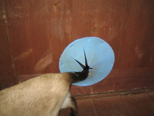 Очень просто установить в нем створку, которая будет свободно открываться в разные стороны. Главное учесть ее вес, чтобы кошка смогла открыть дверцу и пройти. Лучше всего для этого использовать кусок пластика или приобрести любое подходящее изделие в строительном магазине.