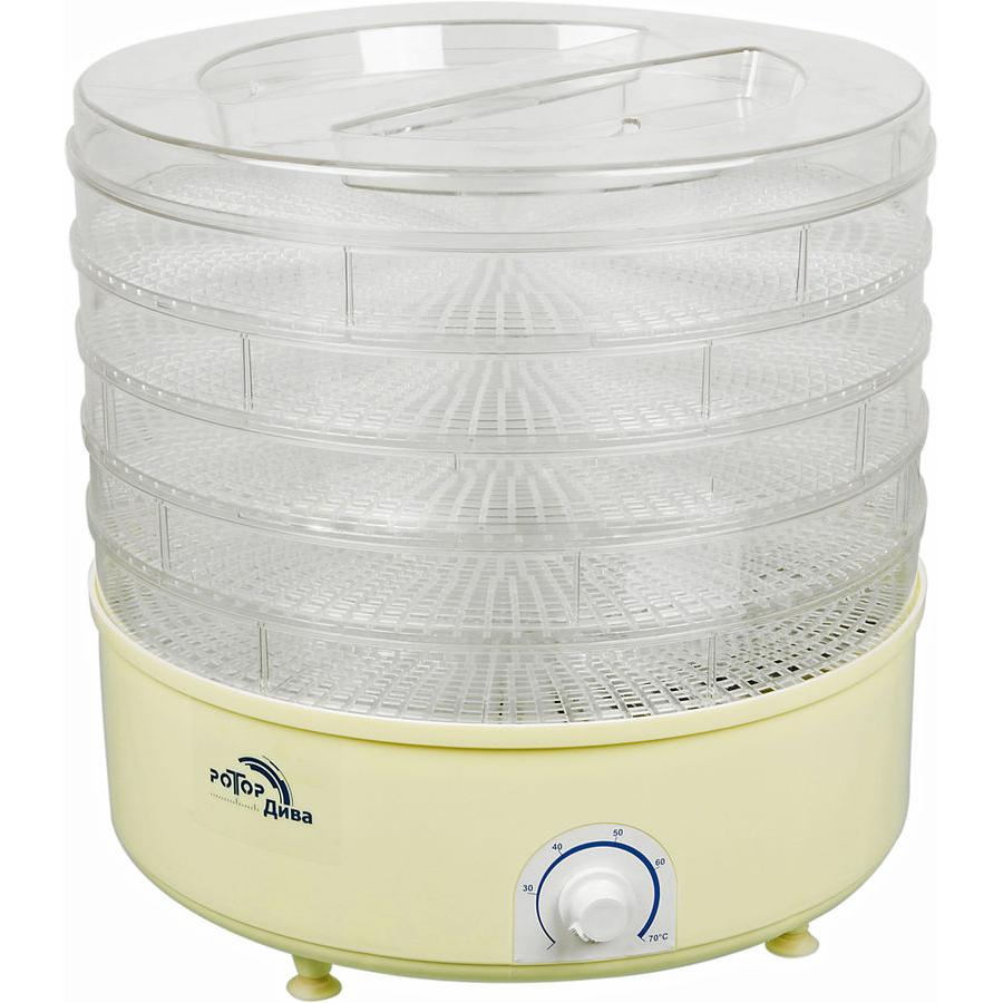 Нижняя часть корпуса выполнена из качественной нержавеющей стали, внутри нее располагается нагревательный элемент, вентилятор и автоматический регулятор температуры. Сверху устанавливаются прозрачные лотки из пищевого пластика. Просушивание фруктов и овощей производится путем потока направленного воздуха, нагретого до температуры от 30 до 70 градусов. Влага устраняется практически полностью, а в продуктах сохраняются все витамины и минералы. Максимальная мощность устройства составляет 520 кВт, общий объем сушильной камеры – 20 литров, при этом прибор занимает минимум свободного места на кухне.