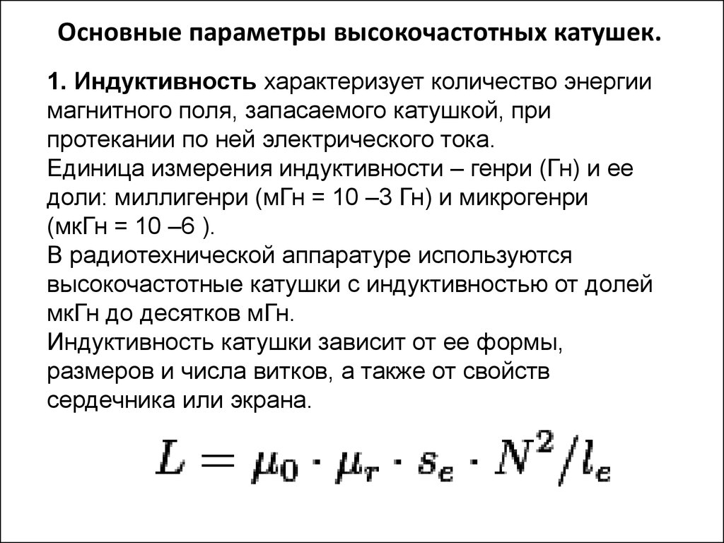 Коэффициент пропорциональности L между силой тока I и магнитным потоком Ф называется индуктивностью контура, измеряется в Гн (Генри). L=Ф/I.