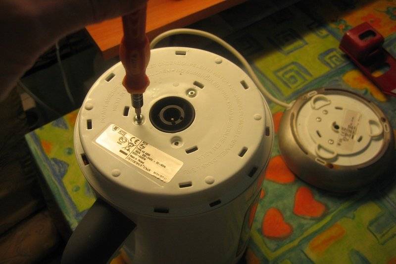 Затем подойдите к нижней части корпуса. Электрочайник нужно перевернуть и найти три самореза, в некоторых моделях их может быть больше, но они на виду, так что сложностей с этим возникнуть не должно.