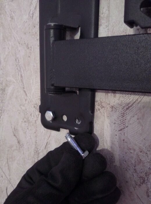- Прикрепление к пластине одной стороны кронштейна после предварительной установки болтов для дальнейшего подвешивания телевизора.
