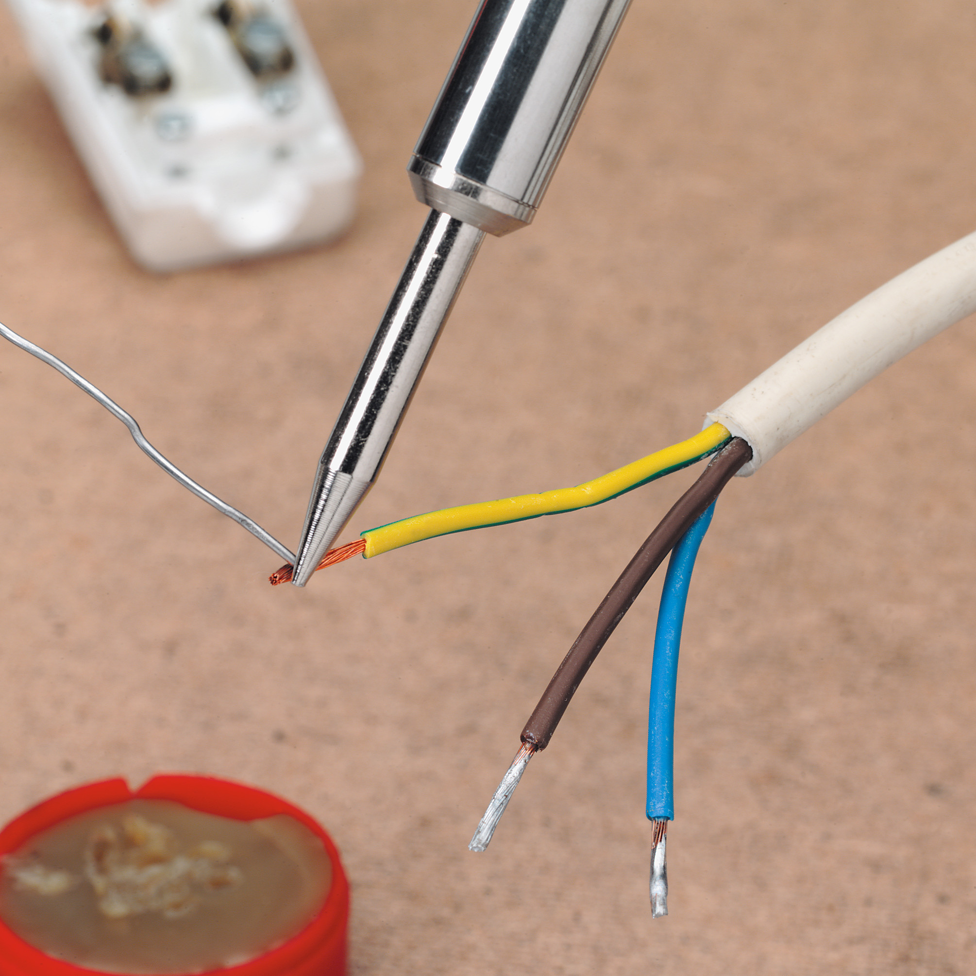 - Зачищенный конец проволоки залудить. При использовании многожильного провода лужение изменит гибкость зачищенного конца провода — он станет более жестким.
