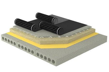 После этапа заливки стяжки следует выполнить гидроизоляцию, чтобы полностью исключить образование конденсата из грунта. Монтируется с помощью специальных рулонных изоляторов – обычно битумного листа или мембранных пленок.