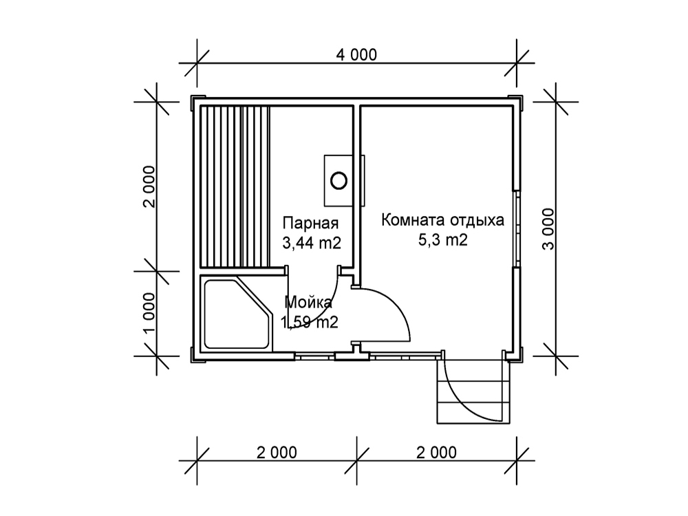 Даже небольшие постройки с размерами 3*4 позволяют разделить внутреннее пространство на парную и помывочную комнату.