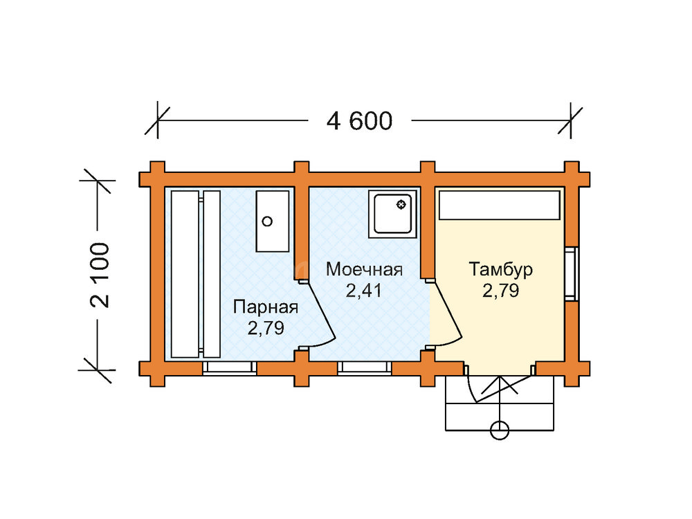 Отгородив небольшой промежуток от комнаты отдыха получаем тамбур при входе и раздевалку или кладовкуДля комфорта и для случая, если в парилке будете отдыхать, нужно разместить тут топчаны. Тогда, наверное, выгородить нужно отдельно душевую кабинку — это 1,2*1,2 м (или больше, если захотите).