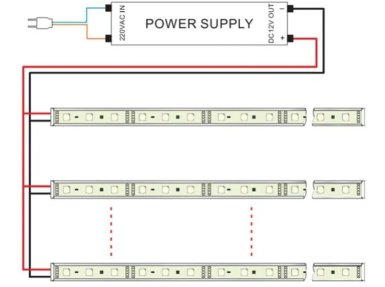 Параллельное соединение положительный (+ ) первой светодиодной ленты к (+) второй светодиодной ленты. Этот шаблон повторяется для дальнейших светодиодных лент, от (+) второй полосы до (+) третьей полосы и так далее.
