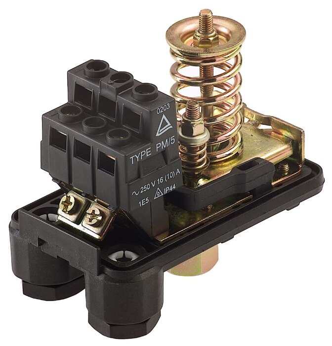 Сначала откручивается пластиковая крышка блока управления. Под ней, на площадке блока, будет две пружины: большая и маленькая. Большая пружина регулирует давление, при котором замыкаются контакты, и запускается помпа. Часто рядом с пружиной выбита на металле буква Р.