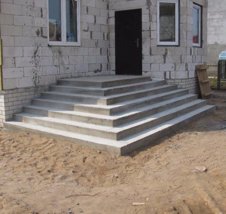 Лестница на крыльцо из бетона заливается поэтапно, начиная с нижней и оканчивая верхней ступенькой.