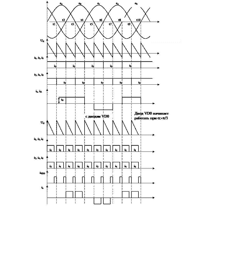 На интервале t2 – t3, также равном p/3, будут открыты диоды VD1 и VD6, к сопротивлению нагрузки будет приложено линейное напряжение между точками а и с, и ток будет протекать в том же направлении по цепи: +uа, VD1, Rd, VD6, —uс.