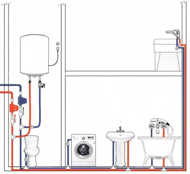 В этом случае проводится разводка водопровода в квартире непосредственно от тройника к тем местам, где предполагается установить душ, унитаз, умывальники, посудомоечную и стиральную машину.