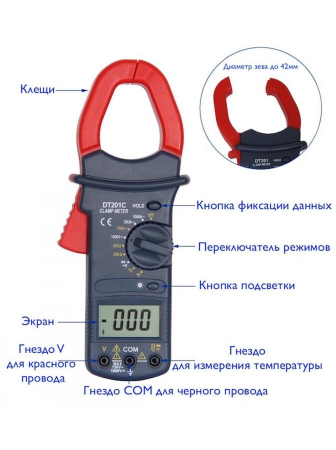 Что касается изображения выше, то вот список основных компонентов токоизмерительных клещей. Мы упомянули детали, которые являются эксклюзивными для этой модели.