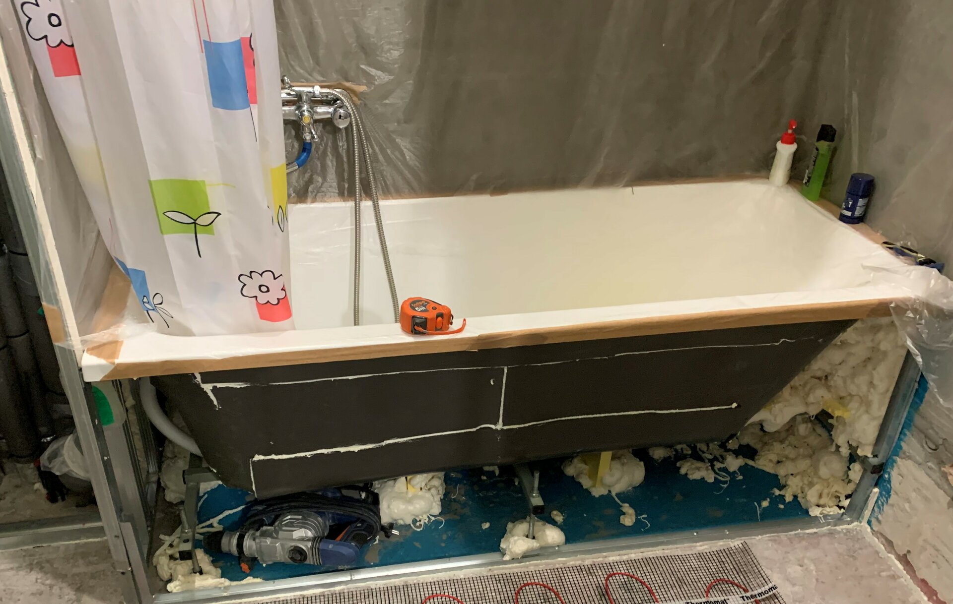 акриловая ванна не остывала еще дольше, чтобы ее можно было утеплить снаружи при помощи полиуретановой монтажной пены.Важное условие: экран должен выполнять не только декоративную, но и защитную функцию, перекрывая доступ влаги к пористому утеплителю. Протекание воды сверху, через стык борта со стеной, устраняется так: край ванны заводится под плитку, а сверху приклеивается пластмассовый либо керамический плинтус.