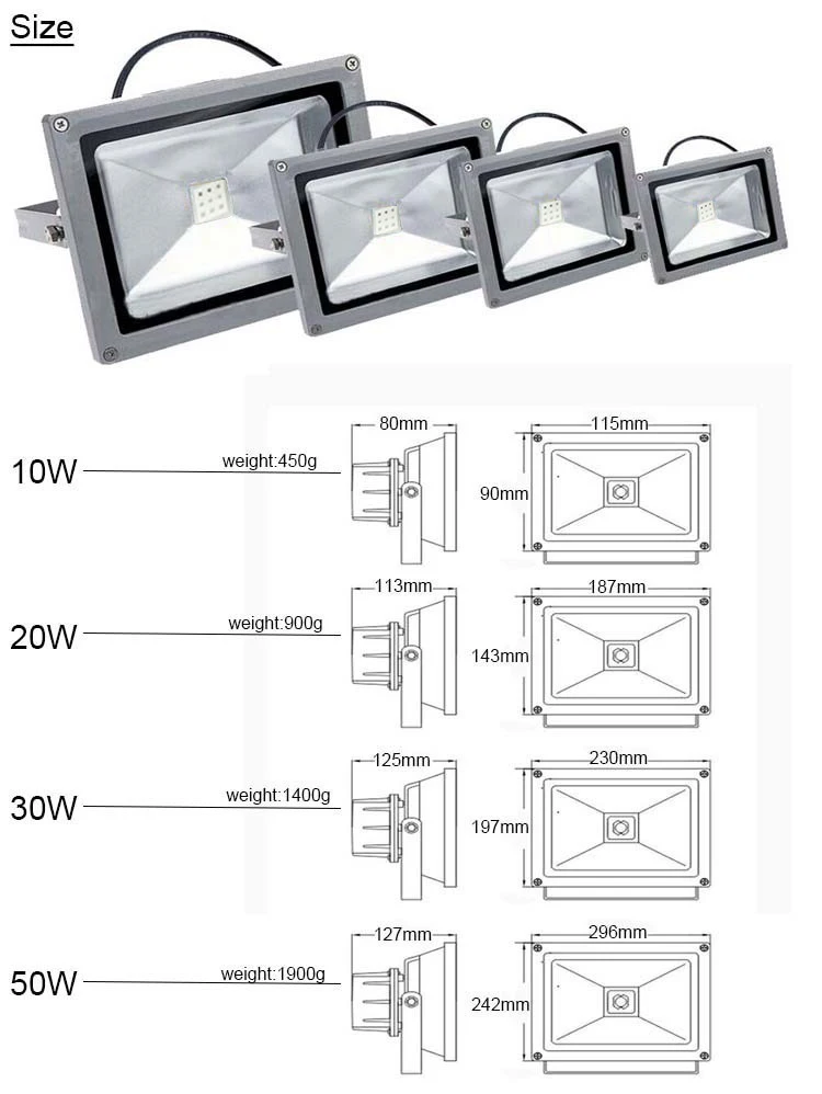 Сегодня светодиодные прожекторы считаются наиболее эффективными, надежными и экономичными осветительными приборами для уличного освещения. При этом продуктивность осветительных приборов может быть разной — в зависимости от потребляемой мощности.