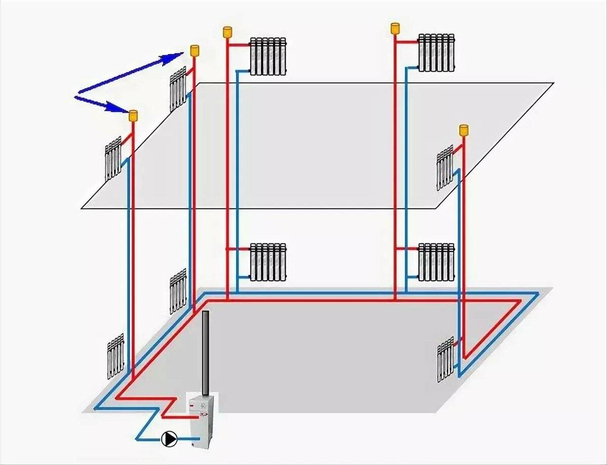 Для больших зданий наиболее эффективна коллекторная схема, тем более что она помогает эффективно встраивать водяные теплые полы. В небольших одноэтажных домах будет оправдано применение горизонтальной или вертикальной тройниковой схемы.