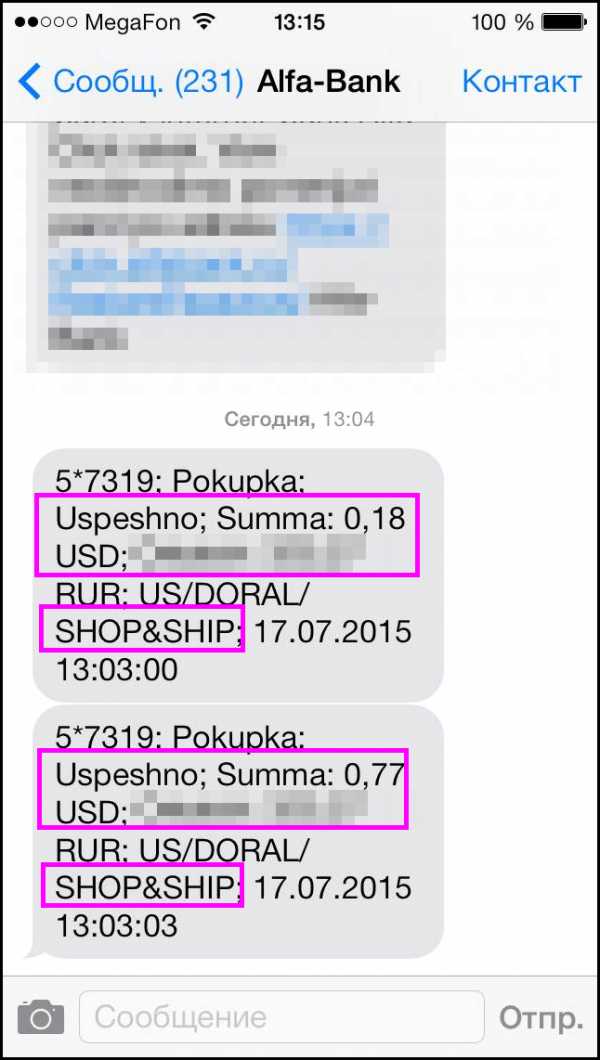 Пример того, как выглядит списание проверочных сумму в SMS сообщение у Альфа-Банка: