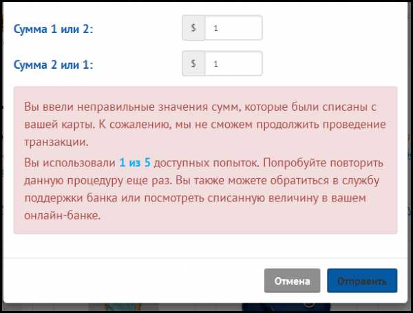Для подтверждения, что вы владелец карты, у вас есть 5 попыток. Если вы введете 5 раз неправильную сумму, то возможность подтвердить вашу карту будет заблокирован на 24 часа. После чего вы сможете повторить данную процедуру.