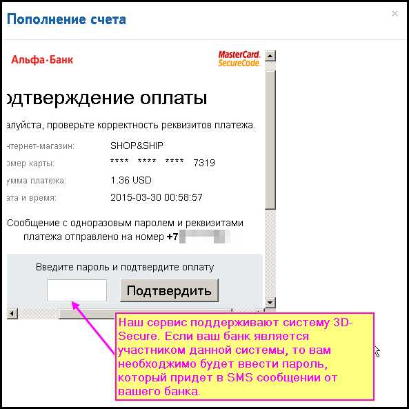 Наш сервис поддерживает систему 3D-Secure, это значит, что если ваш банк также поддерживает данную систему, то вам будет отправлен одноразовый пароль от вашего банка для подтверждения вашего платежа.