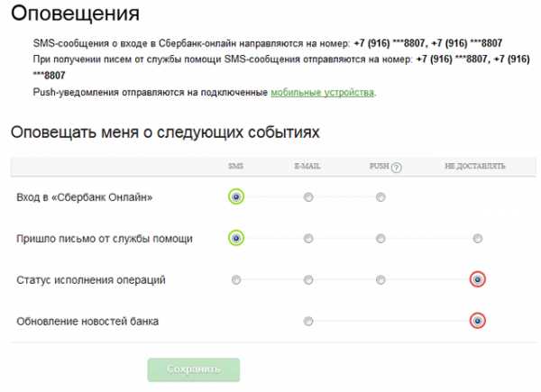 Настройка получения уведомлений системы Сбербанк ОнЛайн
