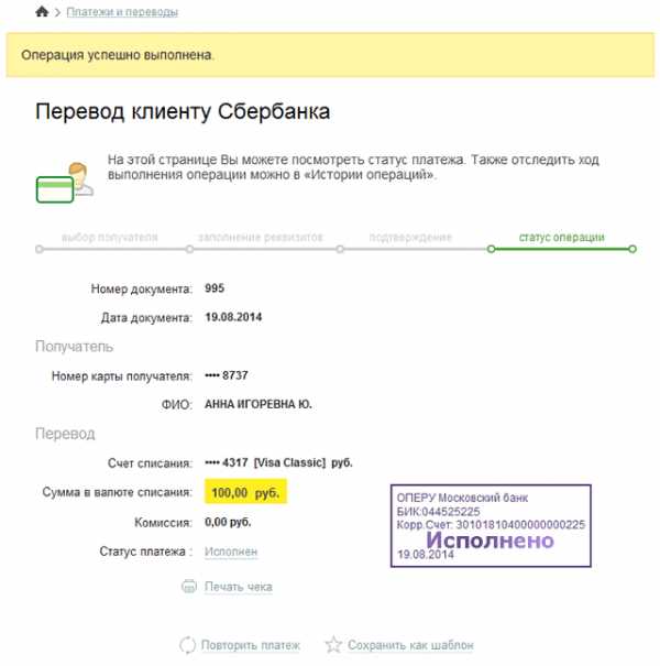 При исполнении в системе Сбербанк Онлайн операций платежей и переводов сторонним получателям чек содержит штамп Банка об исполнении операции: