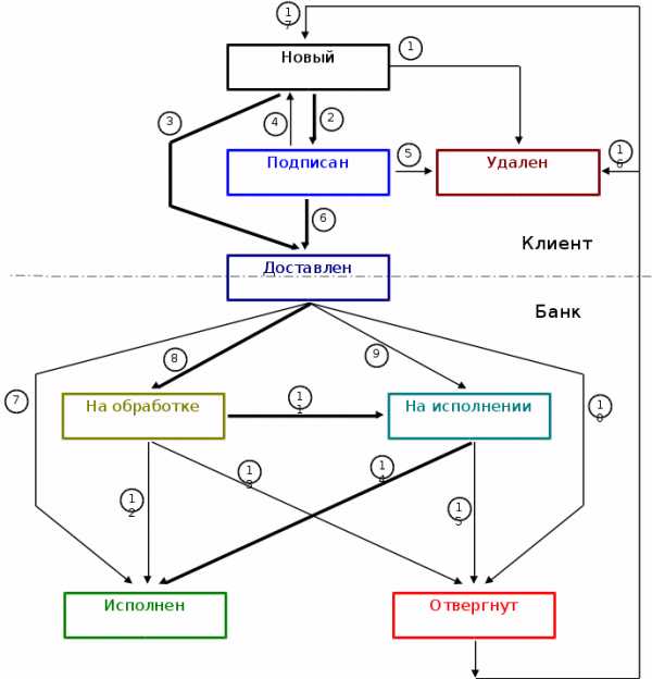 Отвергнут –> Удален. Статус «Удален» устанавливает Клиент при удалении отвергнутого Банком документа.